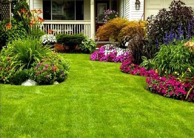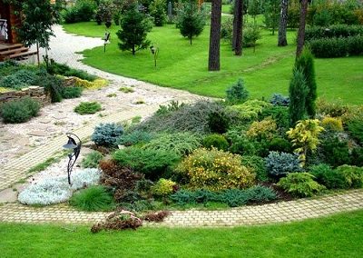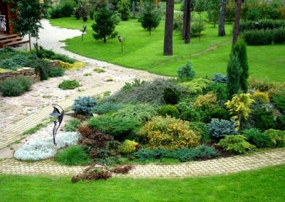 - Озеленение, которое подразумевает посадку растений, в том числе крупных деревьев, создание альпийских горок, альпинариев, клумб, цветников и т.д.